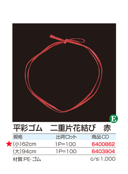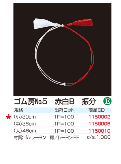 | ●入数:100本入 ●サイズ:(小)56cm (大)75cm ●材質:PE・ゴム 房/レーヨン・PE 商品説明:御赤飯の折箱や贈答用の桐箱、クリスマスツリーの飾りにもどうぞ |