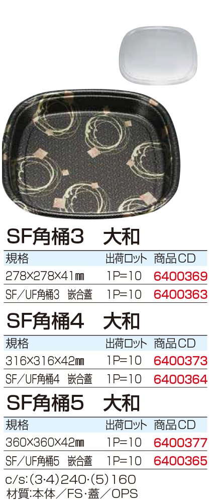 | 仕出容器 SF角桶5 大和 ¥1969 (10個入) 360mm×360mm×42mm 型番:6400377 仕出容器 SF/UF角桶5 嵌合蓋 ¥1077 (10個入) 362mm×362mm×5mm 型番:6400365 |