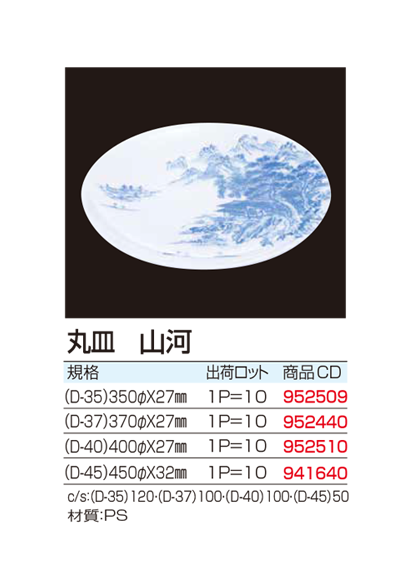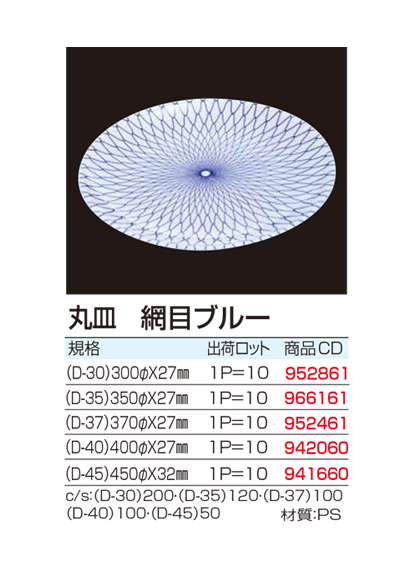 | ●入数:10枚入 ●サイズ:300Φx27mm 350Φ27mm 370Φ27mm 400Φ27mm 450Φ32mm ●材質:PS 商品説明:サイズ違い、柄違いの物など取り揃えております |