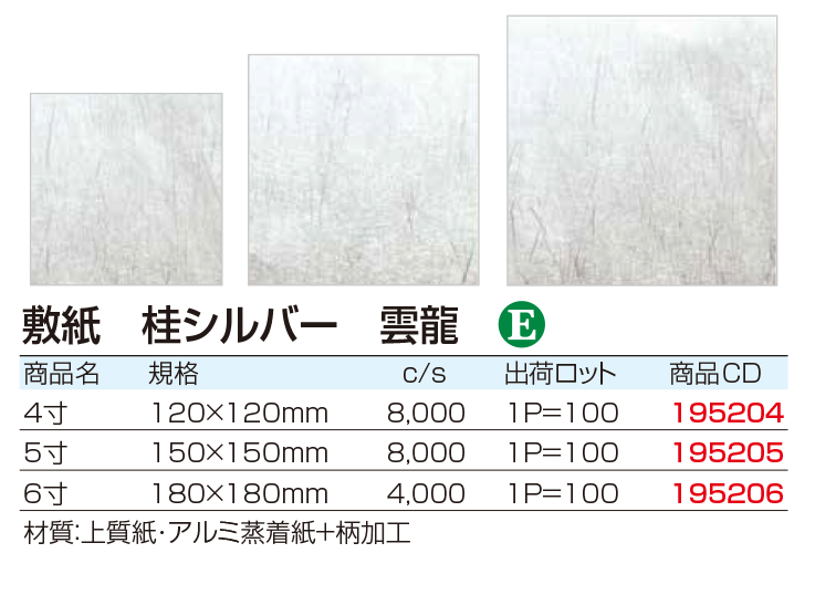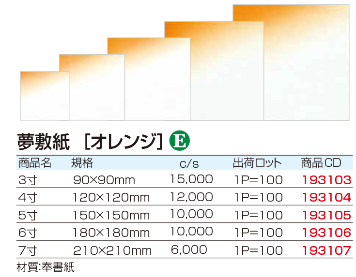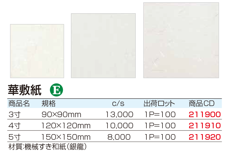 4寸 120mm×120mm 型番:195204 ¥4389 (100枚入) 5寸 150mm×150mm 型番:195205 ¥5519 (100枚入) 6寸 180mm×180mm 型番:195206 |